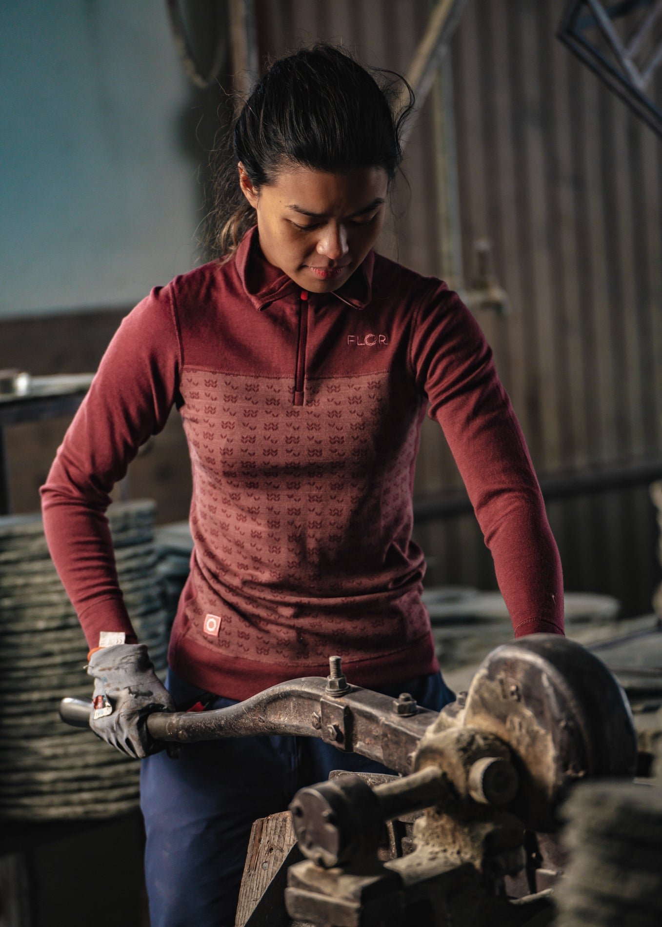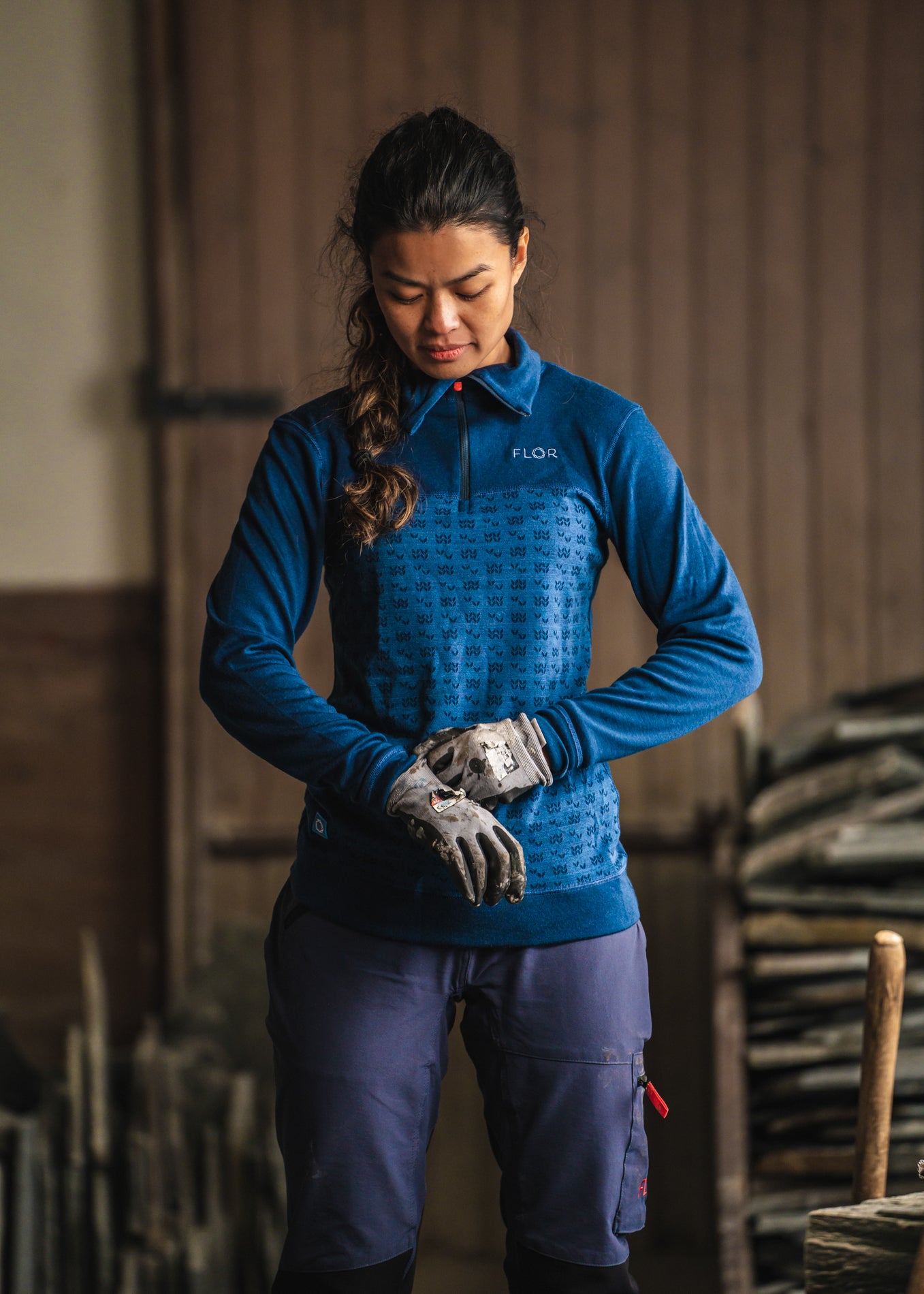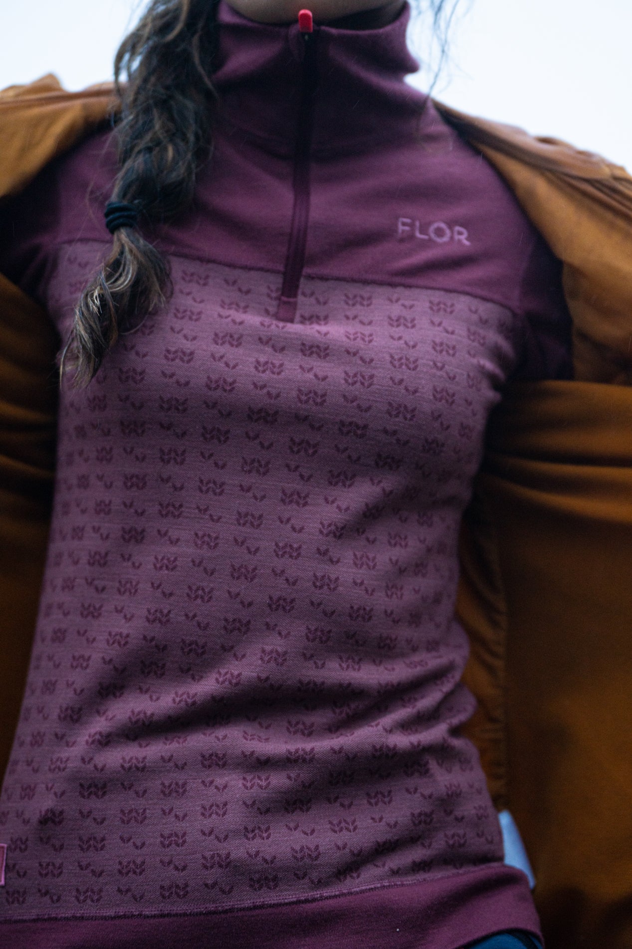 Með innblástur frá hinni klassísku ullarpeysu sem norðmenn kalla “islender-genser” hefur Flor þróað fatalínu af ullarfatnaði sem hentar vel sem innsta lag. Fatnaðurinn er úr 100% merino ull sem er náttúrulegt efni með þá praktísku eiginleika að lykta lítið og aðlagast vel að líkamanum. Þessi ullarbolur er með háan kraga og rennilás sem gerir þér kleift að stilla betur hitastigið þegar þú ert við vinnu eða jafnvel fjallgöngu.